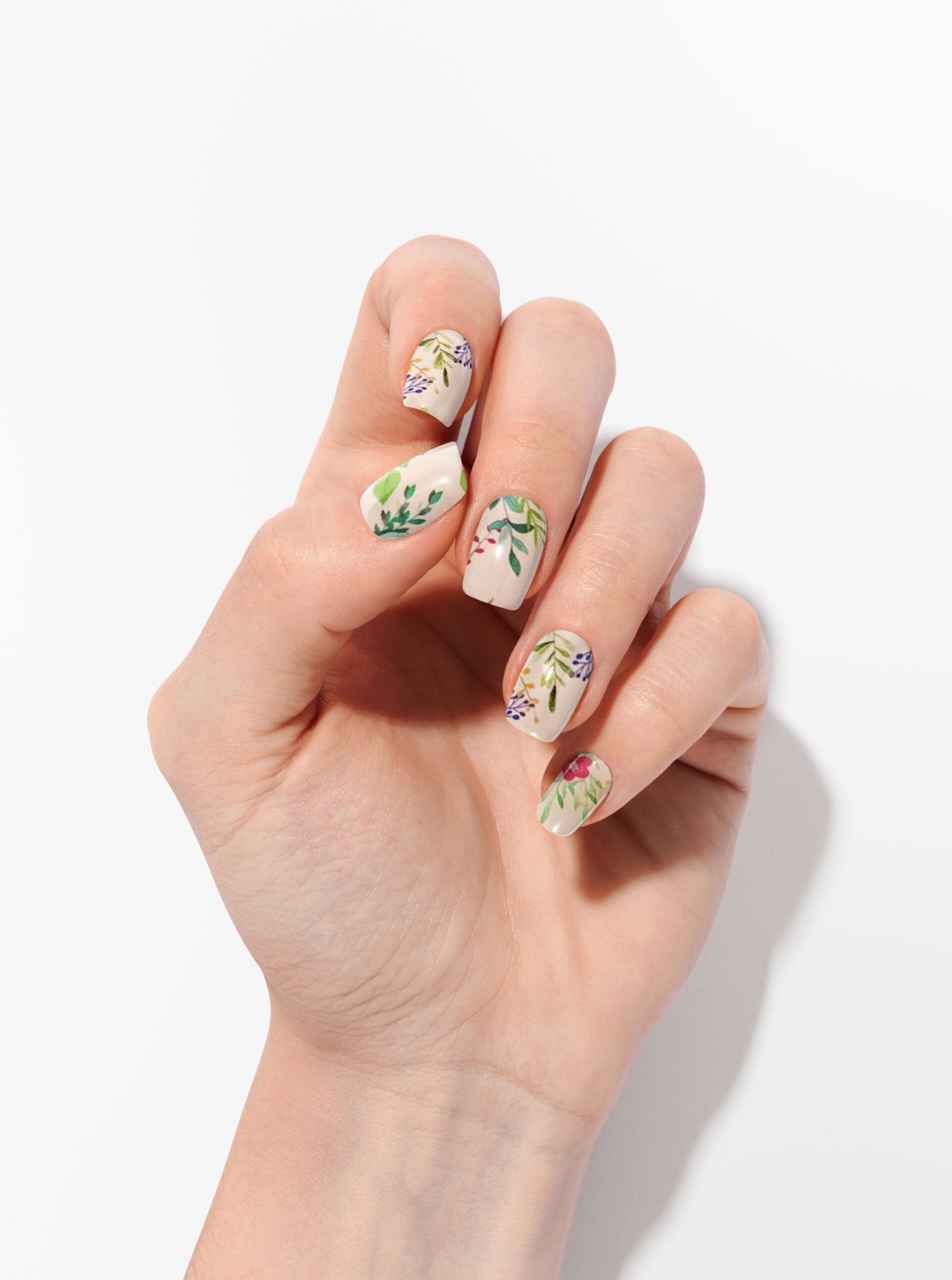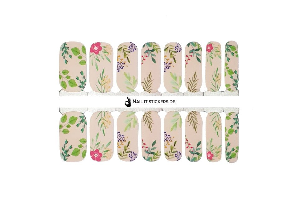 Diese Nagelfolien im natürlichen Stil zeigen einen roséfarbenen Nude-Untergrund, verziert mit floralen und blattartigen Illustrationen in Grün-, Blau-, Rot- und Gelbtönen. Das Design wirkt frisch, harmonisch und erinnert an einen modernen, botanischen Look. 🌿💐